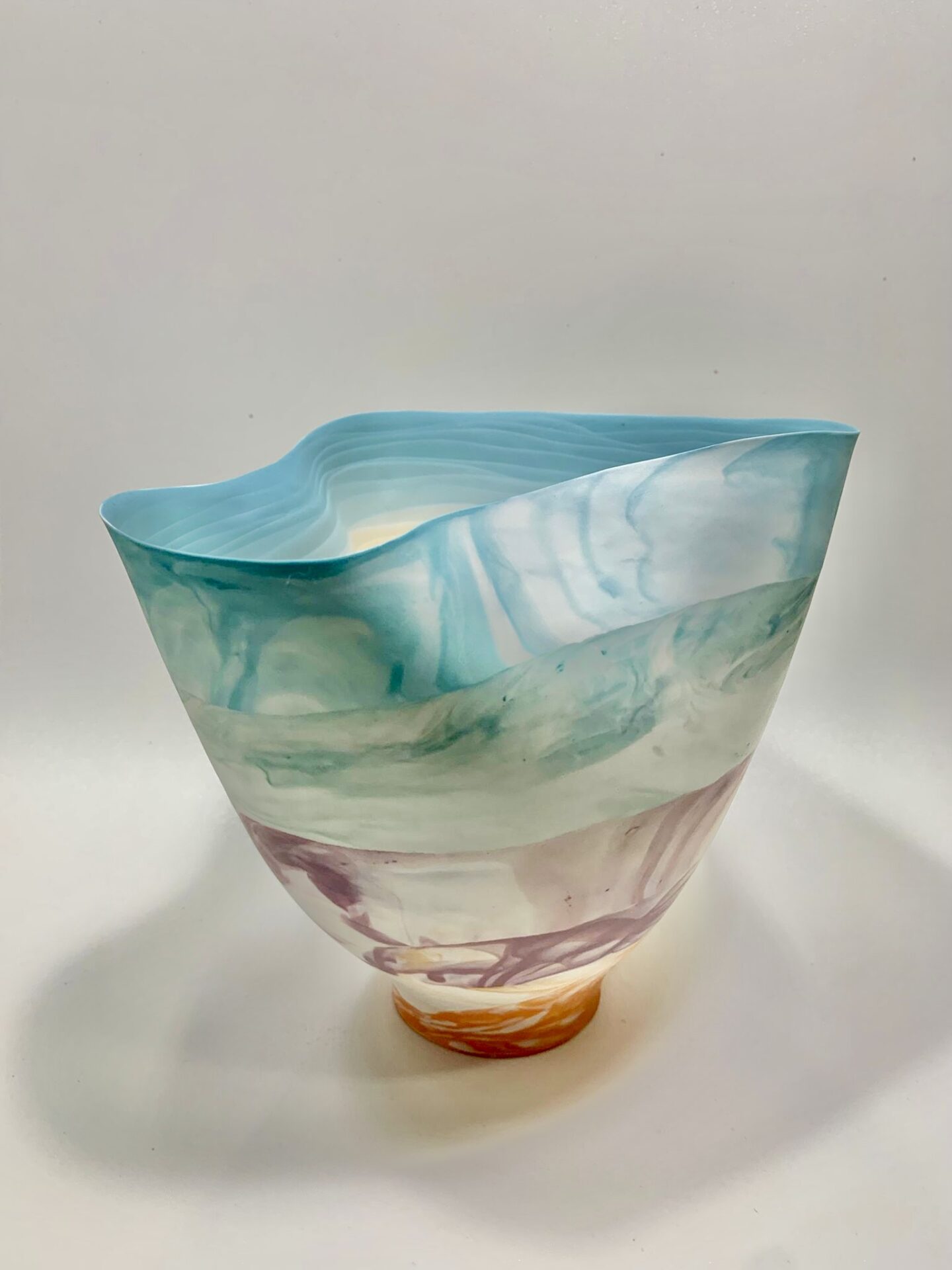 Horizons represents a skyscape that goes beyond what one is able to see, know, or anticipate. Handcrafted specially for Checkpoint Celebrates! 2024, the unique contours and patterns of the vessel present a landscape that changes when viewed from different angles. As you gaze upon the work, the experience calls to mind the ephemeral beauty around us, and the importance of taking a moment to slow down and appreciate it.